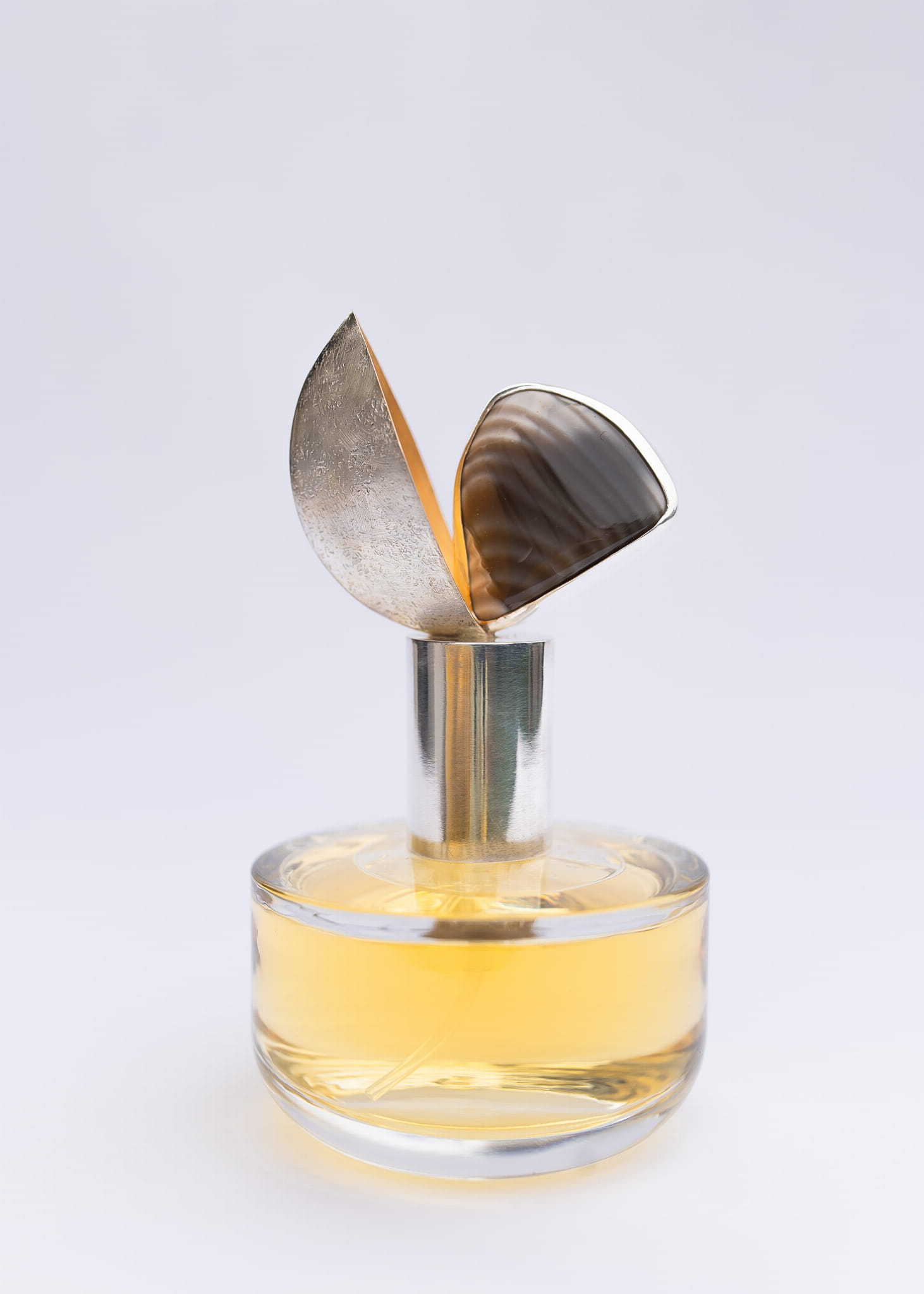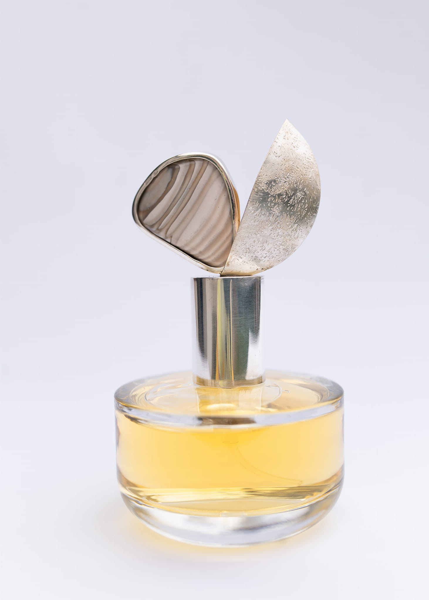 At its heart is banded flint, set in intricately forged 925 silver. The amount of silver used in each bottle ranges from 30 to 50 grams. The choice of banded flint was intentional. It is an endemic stone, found only in one place in the world, my native region of Świętokrzyskie!