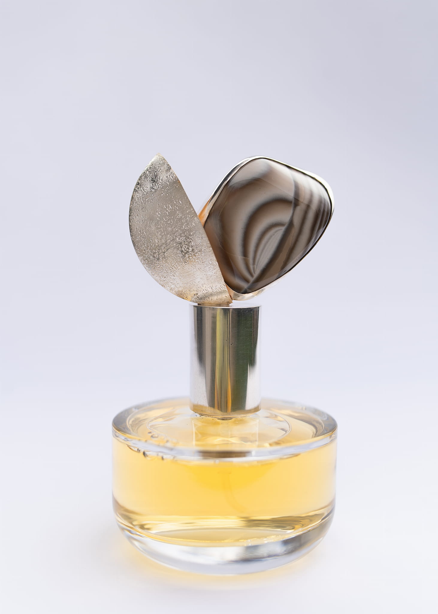At its heart is banded flint, set in intricately forged 925 silver. The amount of silver used in each bottle ranges from 30 to 50 grams. The choice of banded flint was intentional. It is an endemic stone, found only in one place in the world, my native region of Świętokrzyskie!
