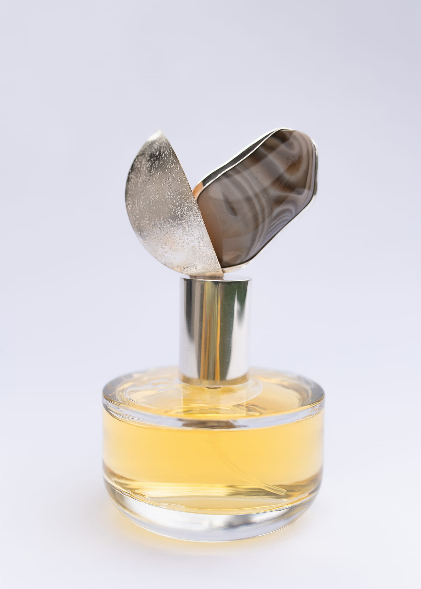 At its heart is banded flint, set in intricately forged 925 silver. The amount of silver used in each bottle ranges from 30 to 50 grams. The choice of banded flint was intentional. It is an endemic stone, found only in one place in the world, my native region of Świętokrzyskie!